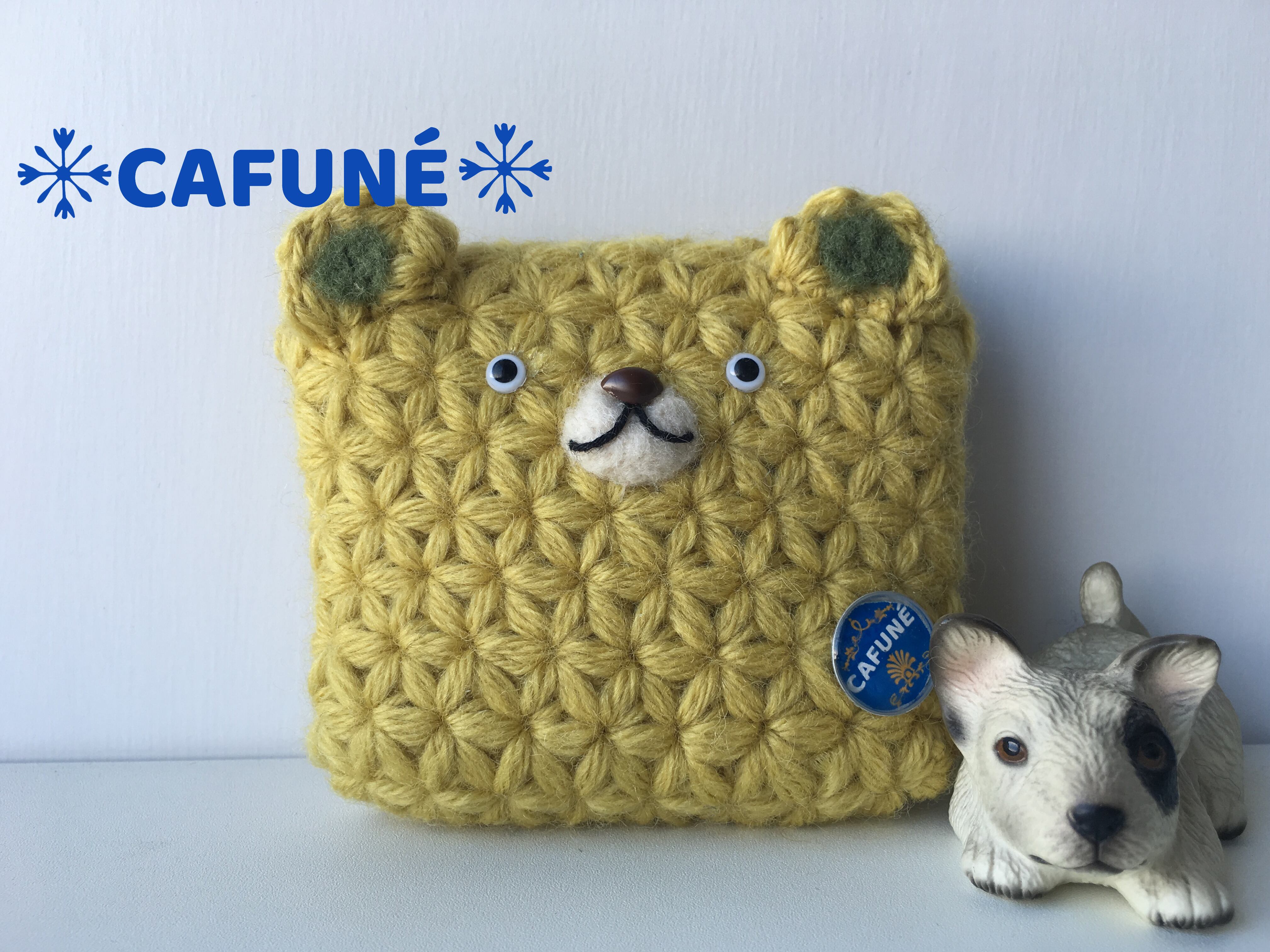 リフ編みで編んだくまちゃんフタ付きボタン留めポーチS
