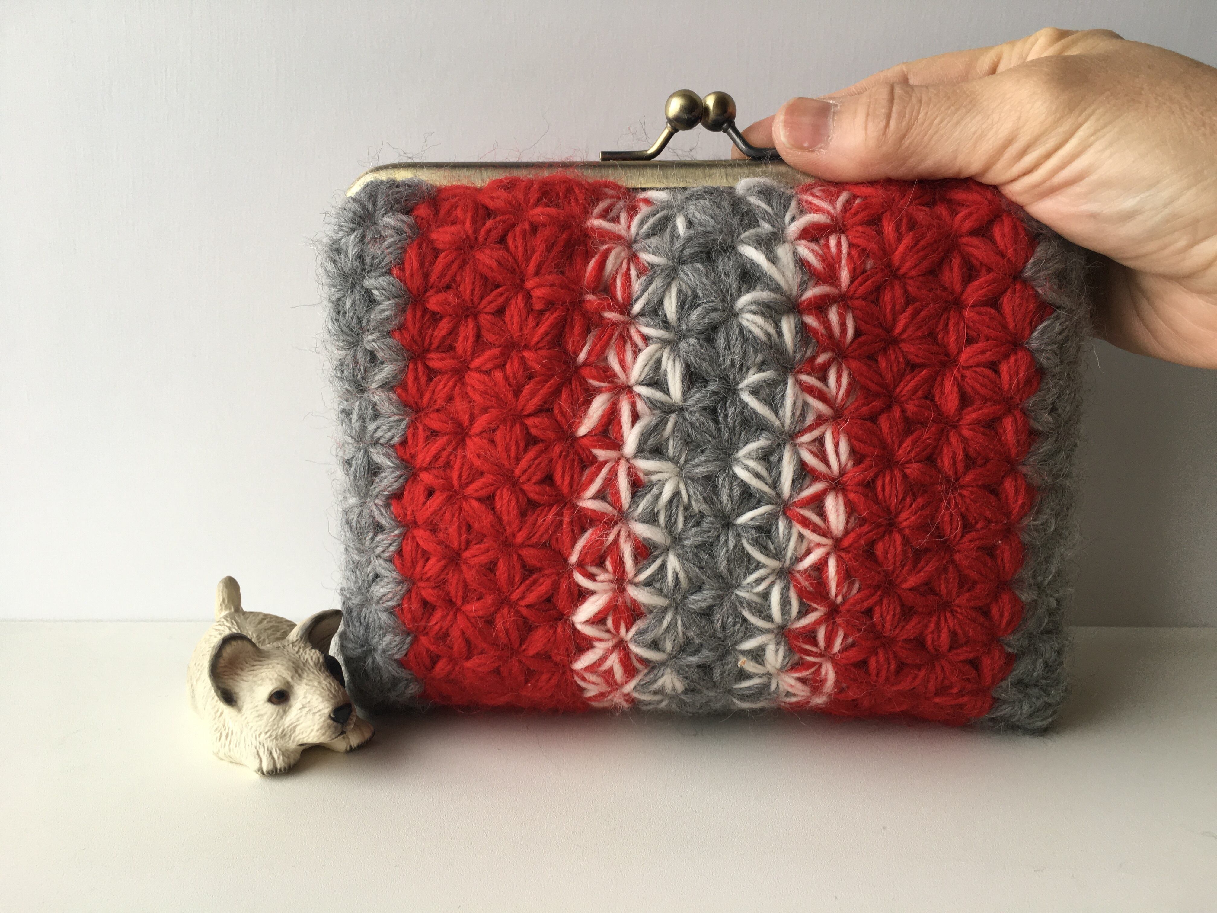 =リフ編みで編んだモダンレトロ風大きめがま口ポーチ=