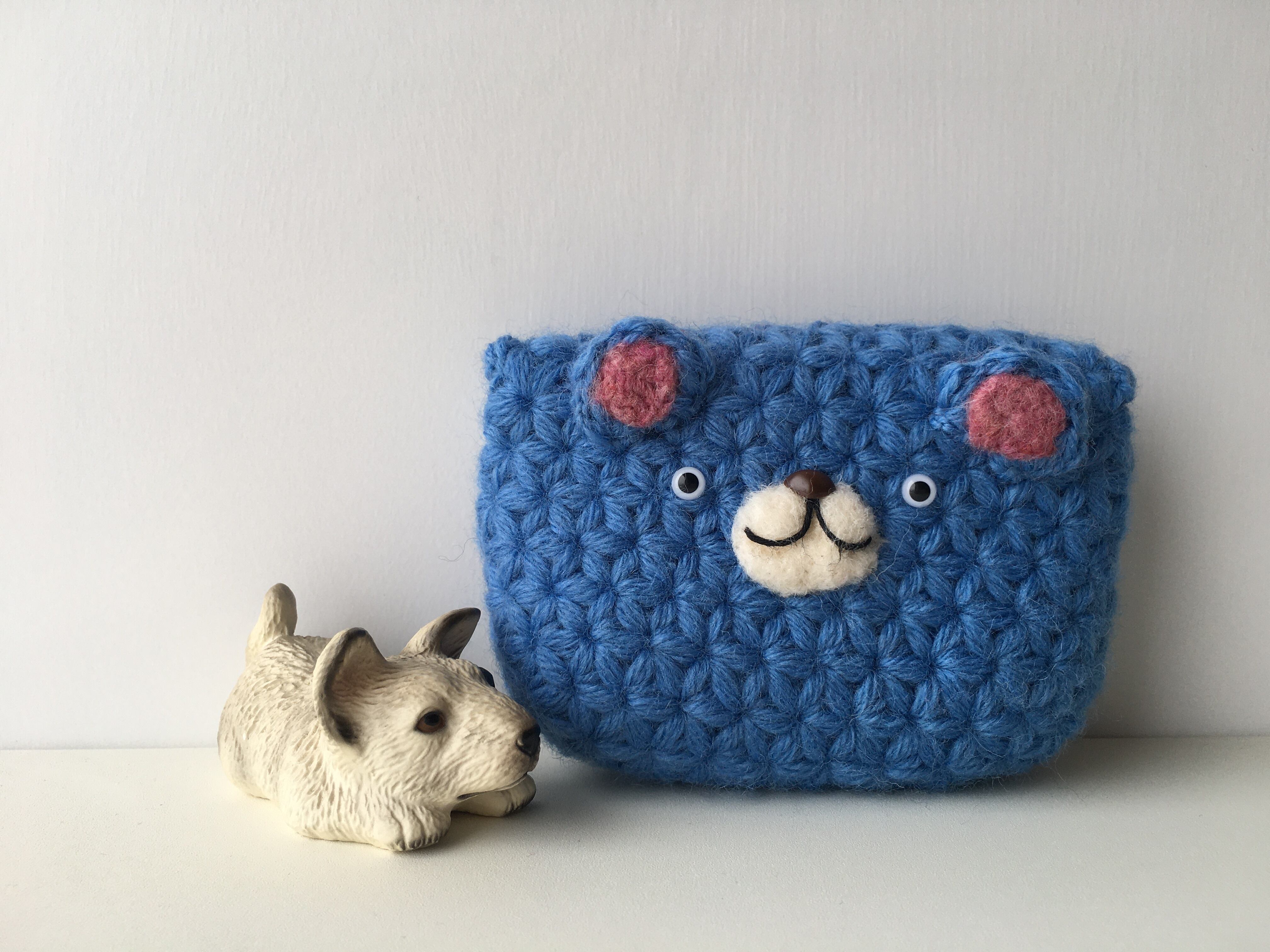 =リフ編みで編んだくまちゃんフタ付きボタン留めポーチ=