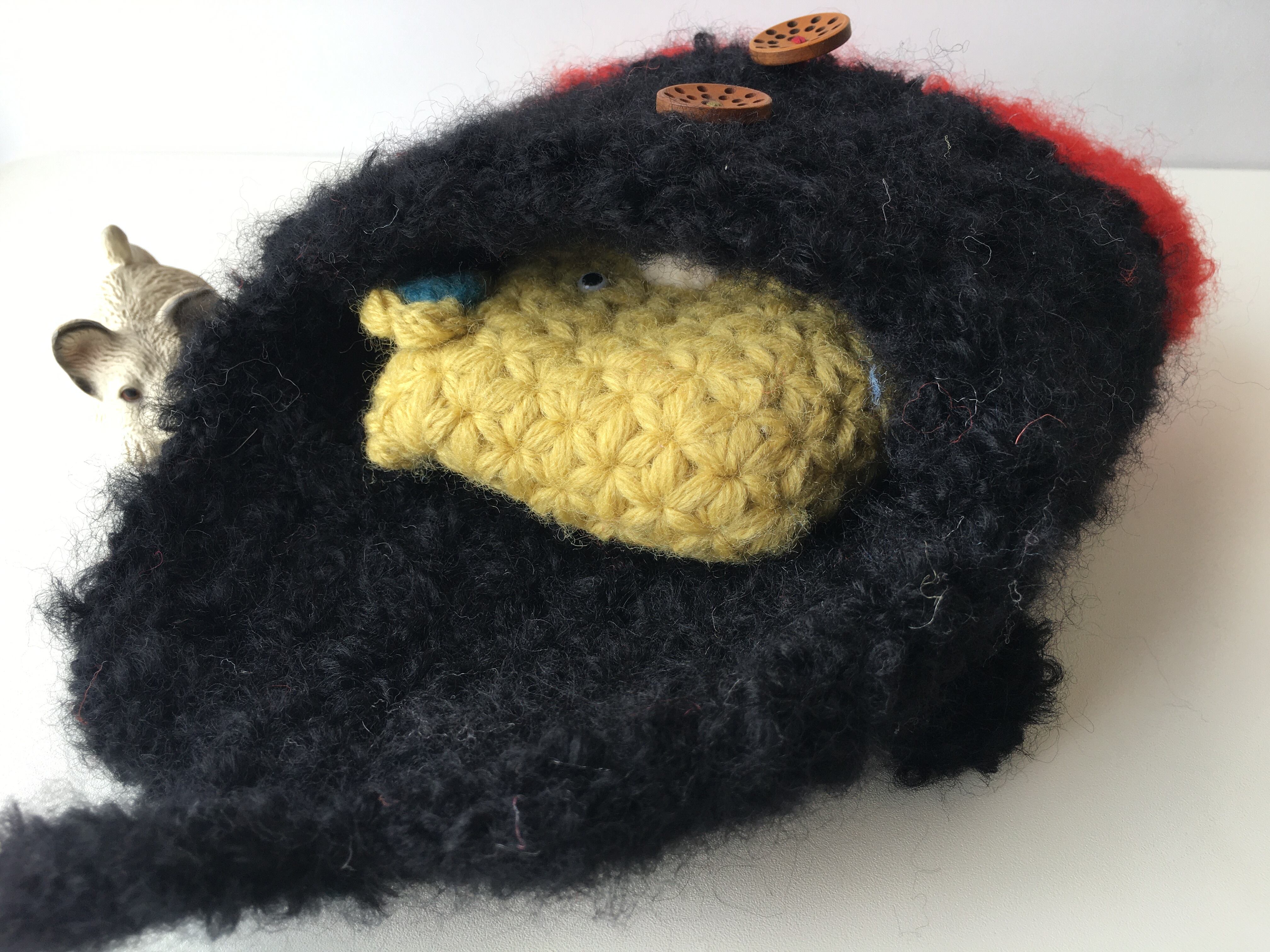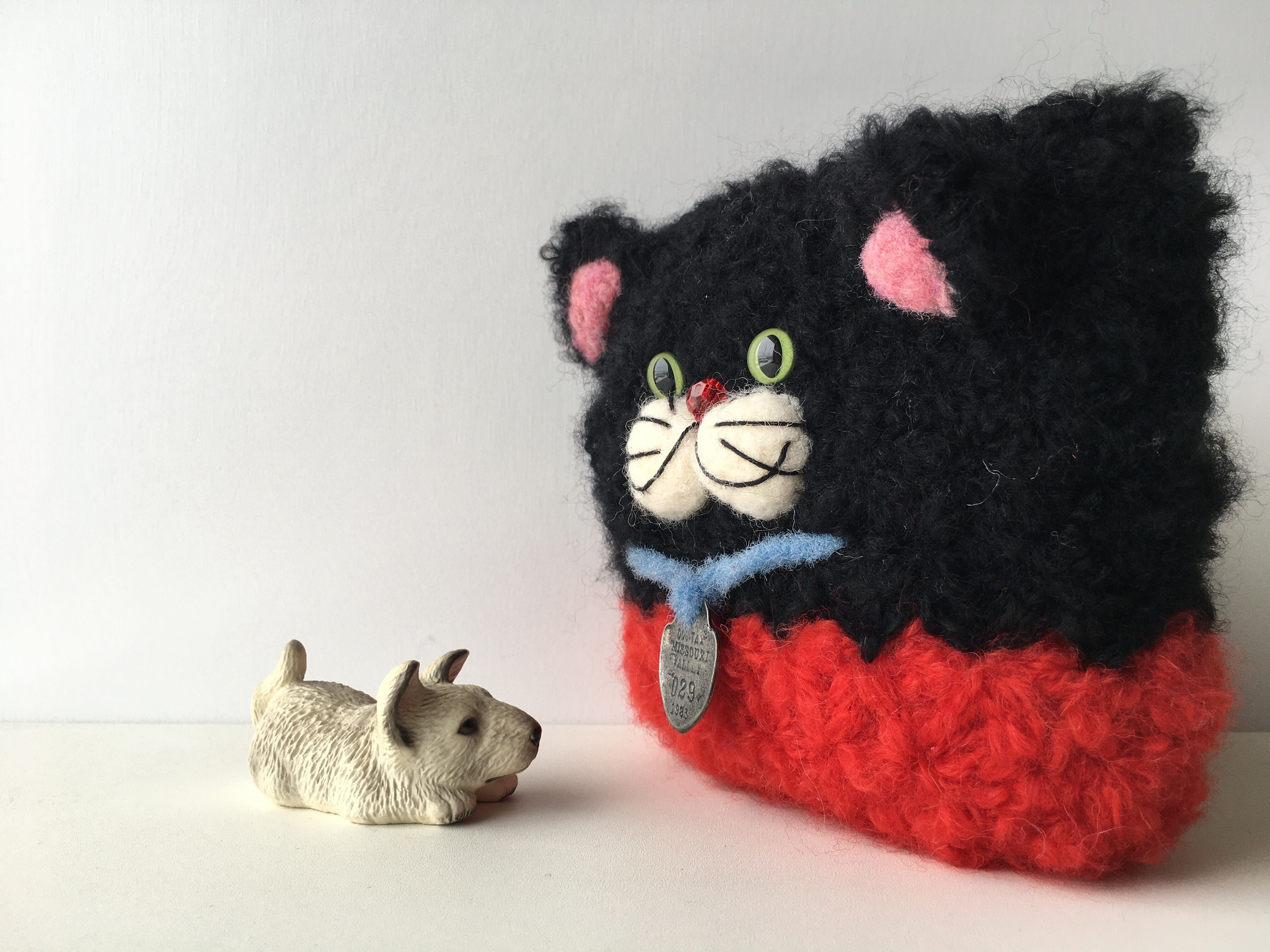 =リフ編みで編んだ黒ネコちゃんフタ付きボタン留めポーチ=