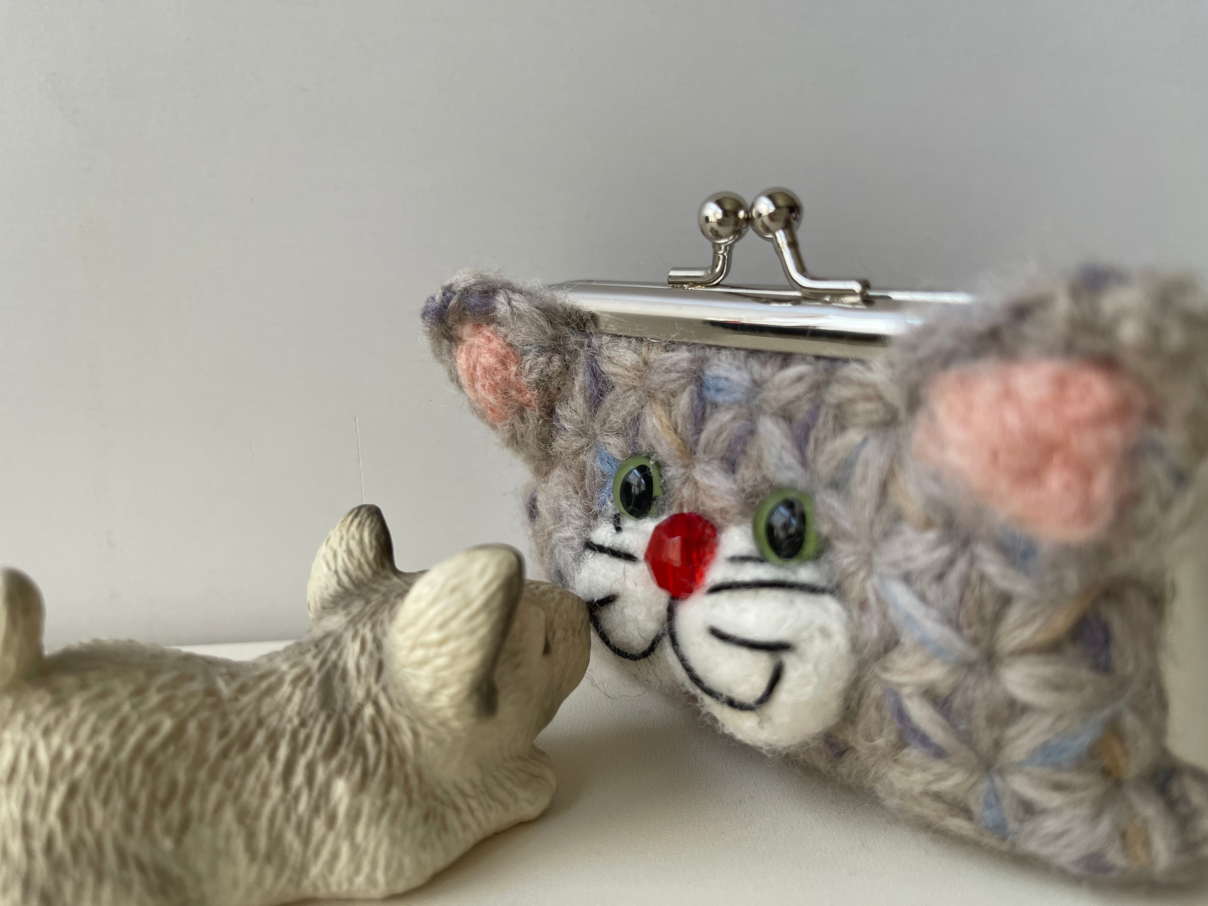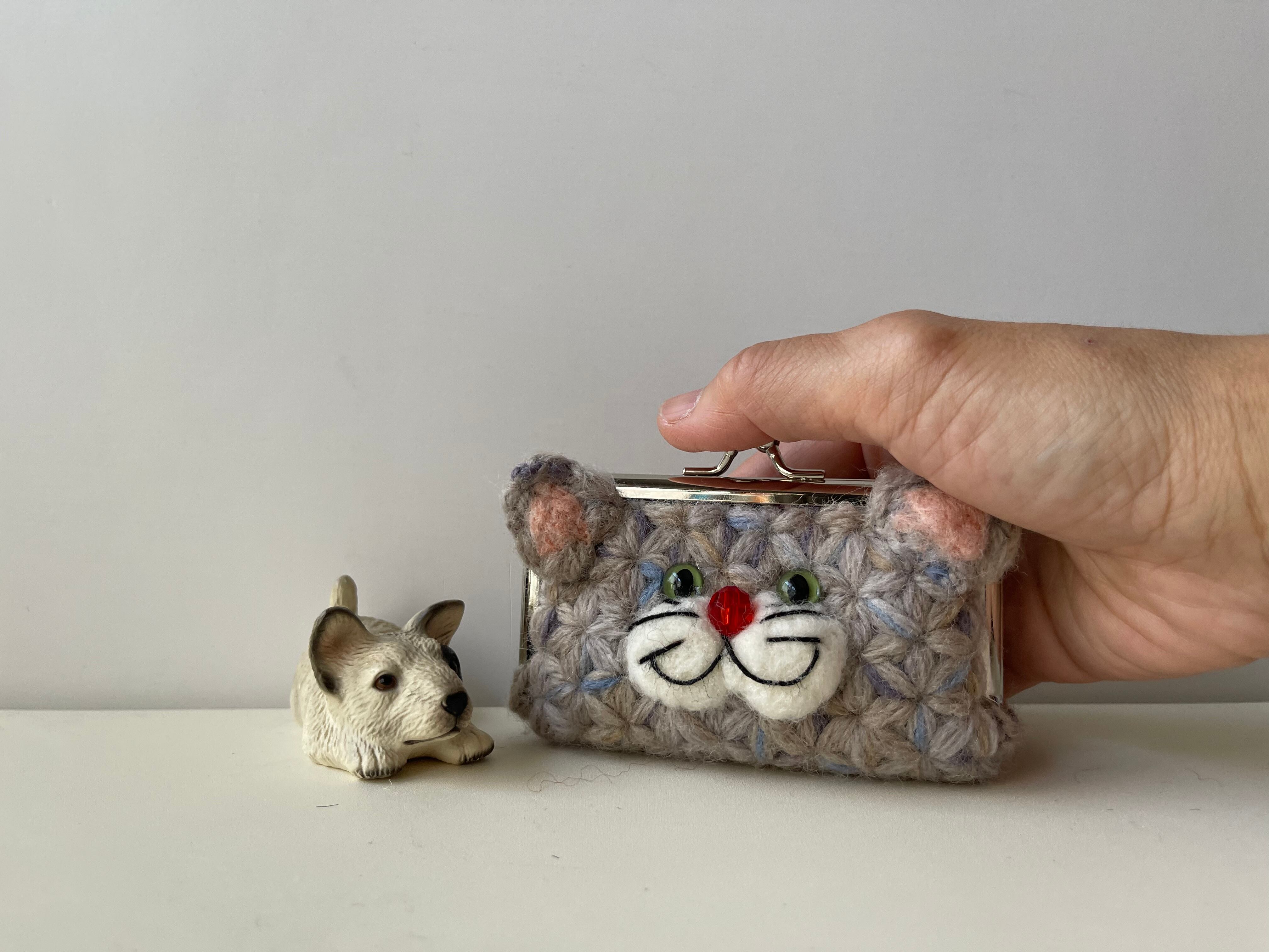 =リフ編みで編んだ四角い顔のねこちゃんがま口=