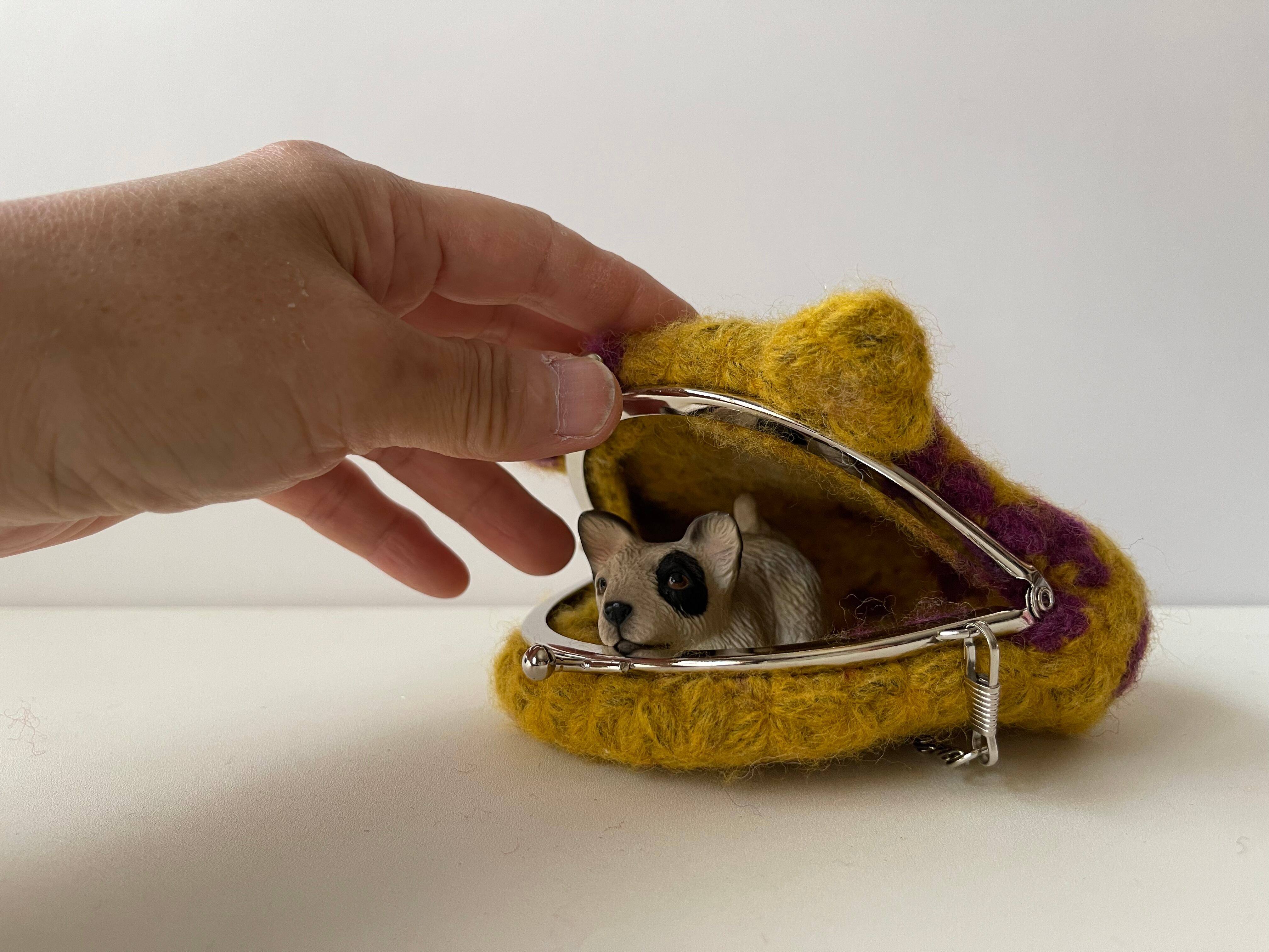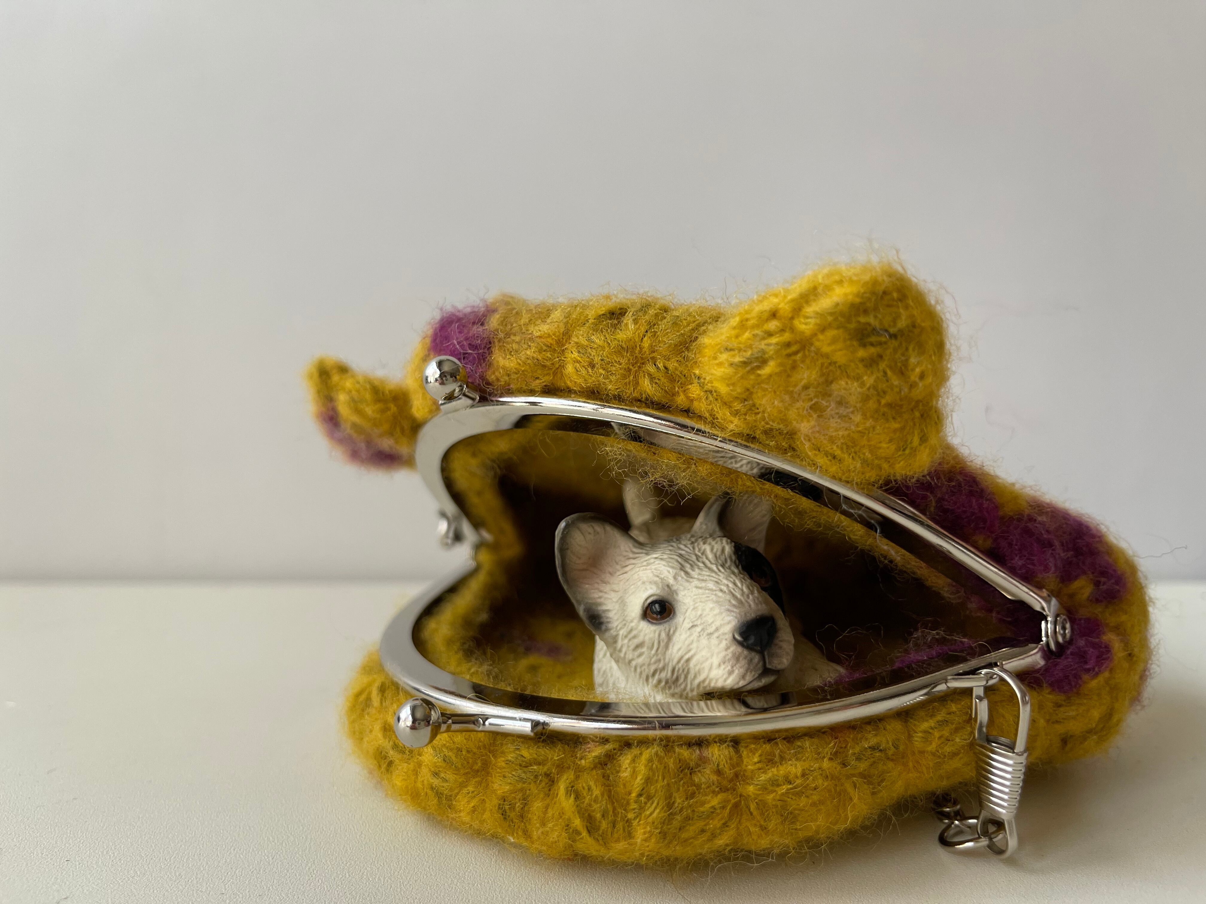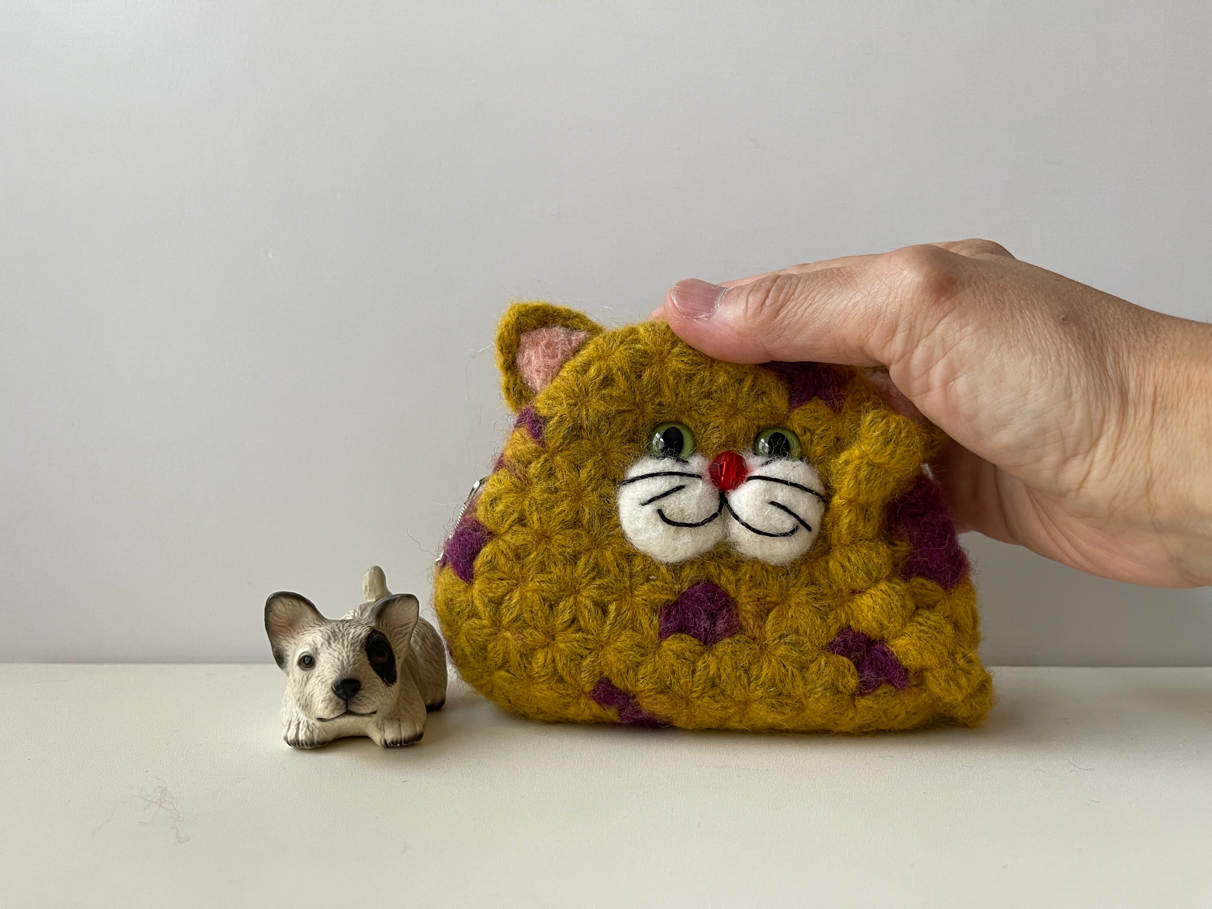 =リフ編みで編んだ緑の目の猫ちゃんがま口ポーチ=