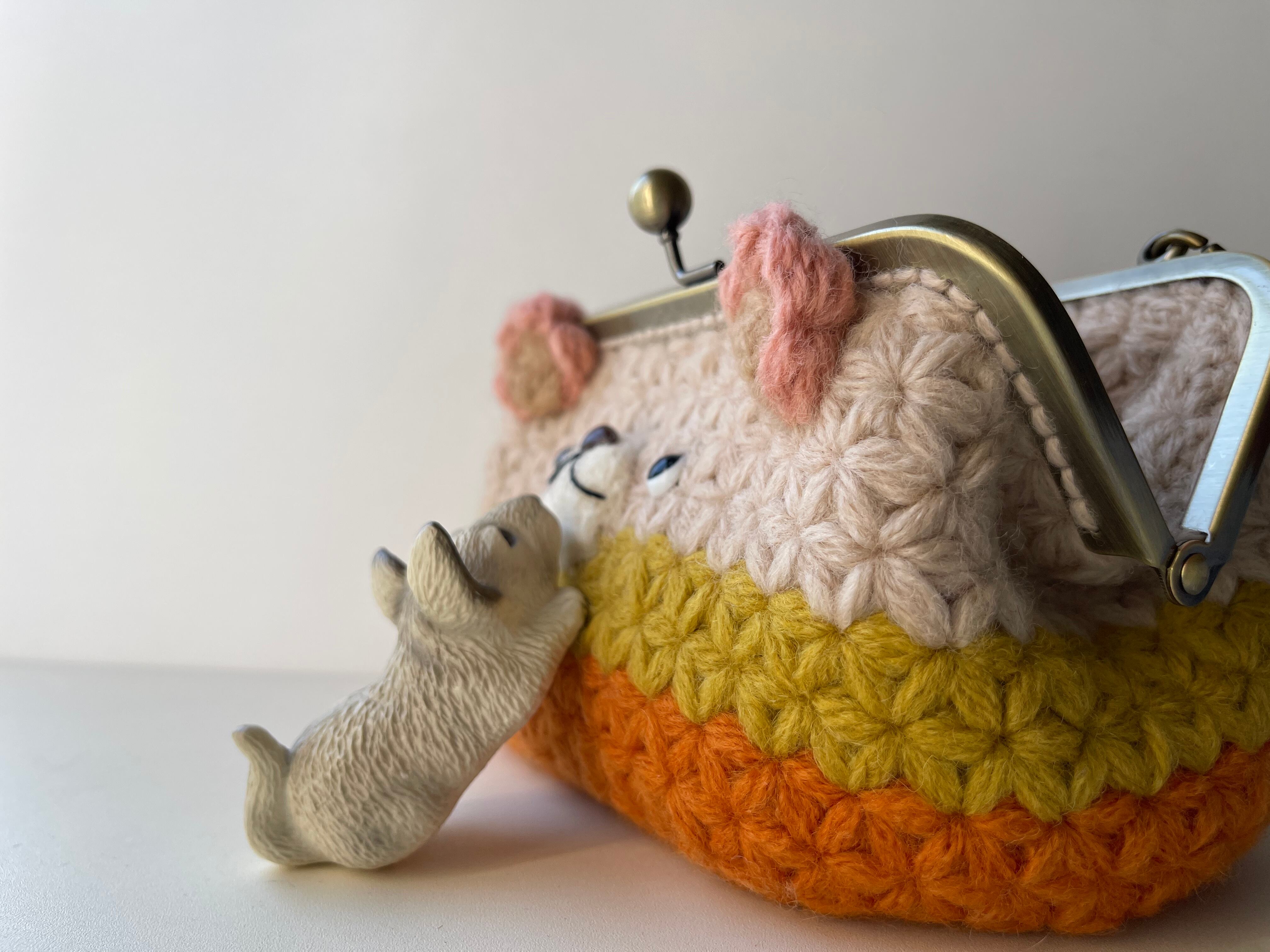 =リフ編みで編んだ3色くまちゃんがま口バック=