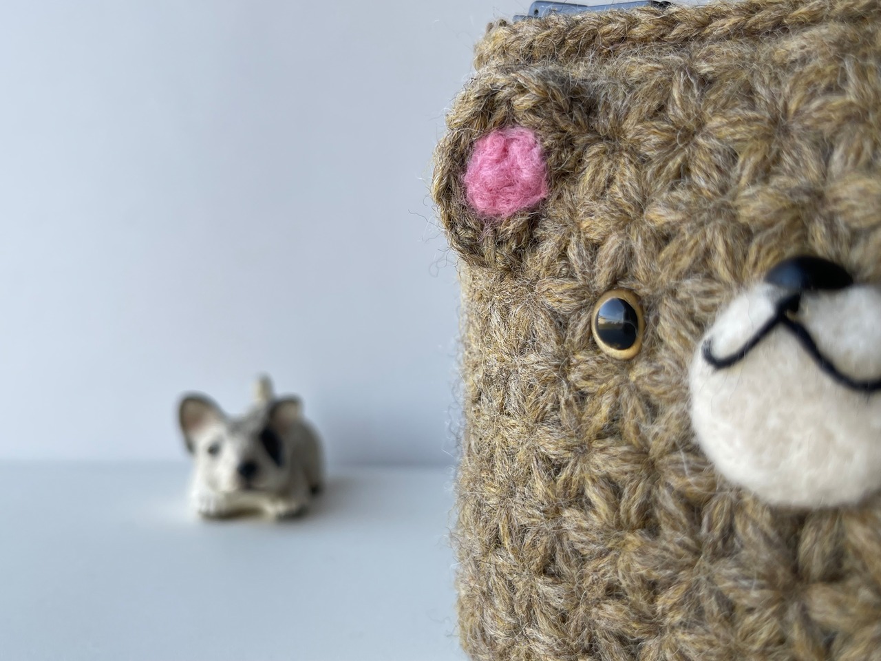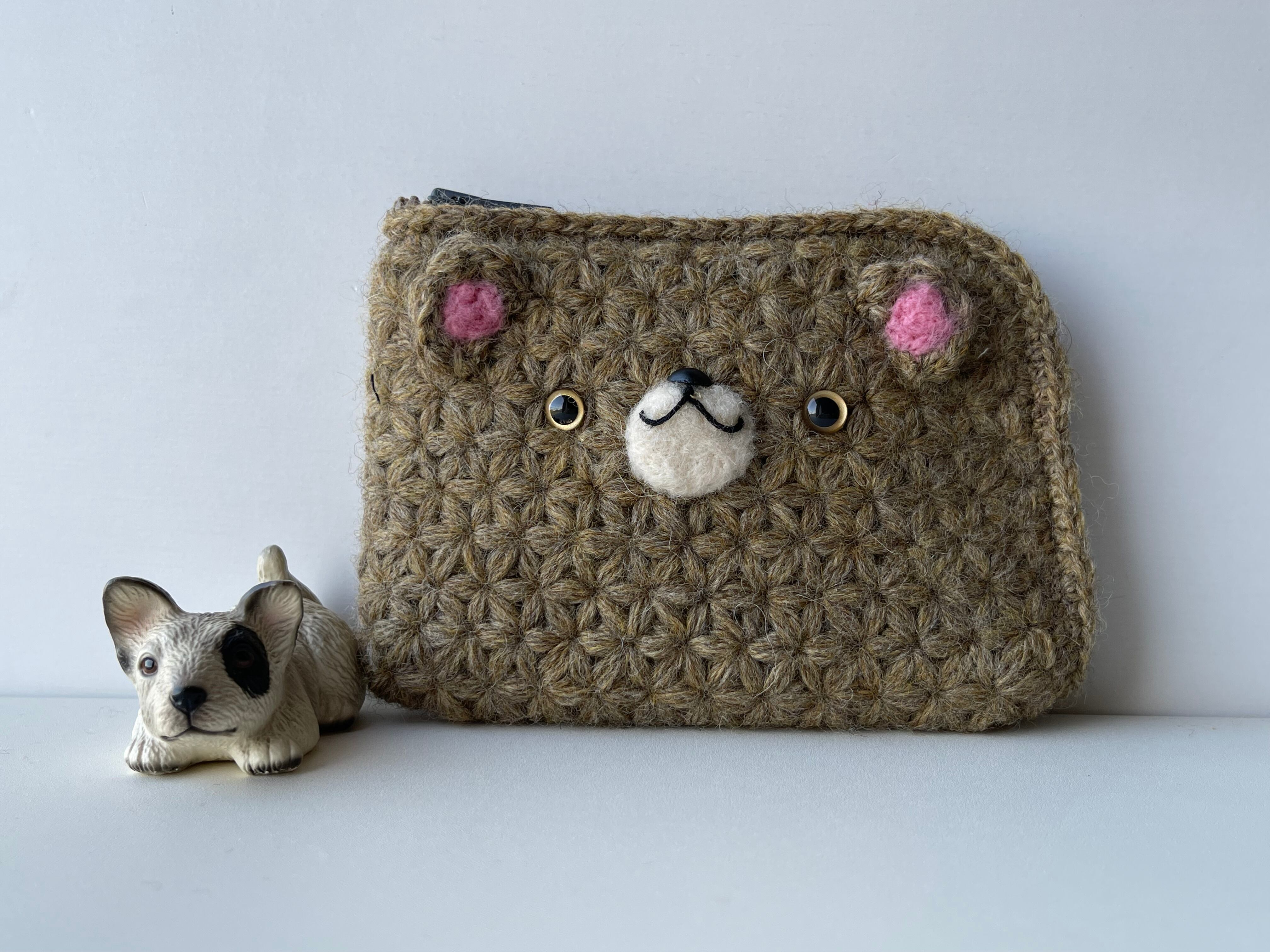 =リフ編みで編んだくまちゃんL字ファスナーポーチ=