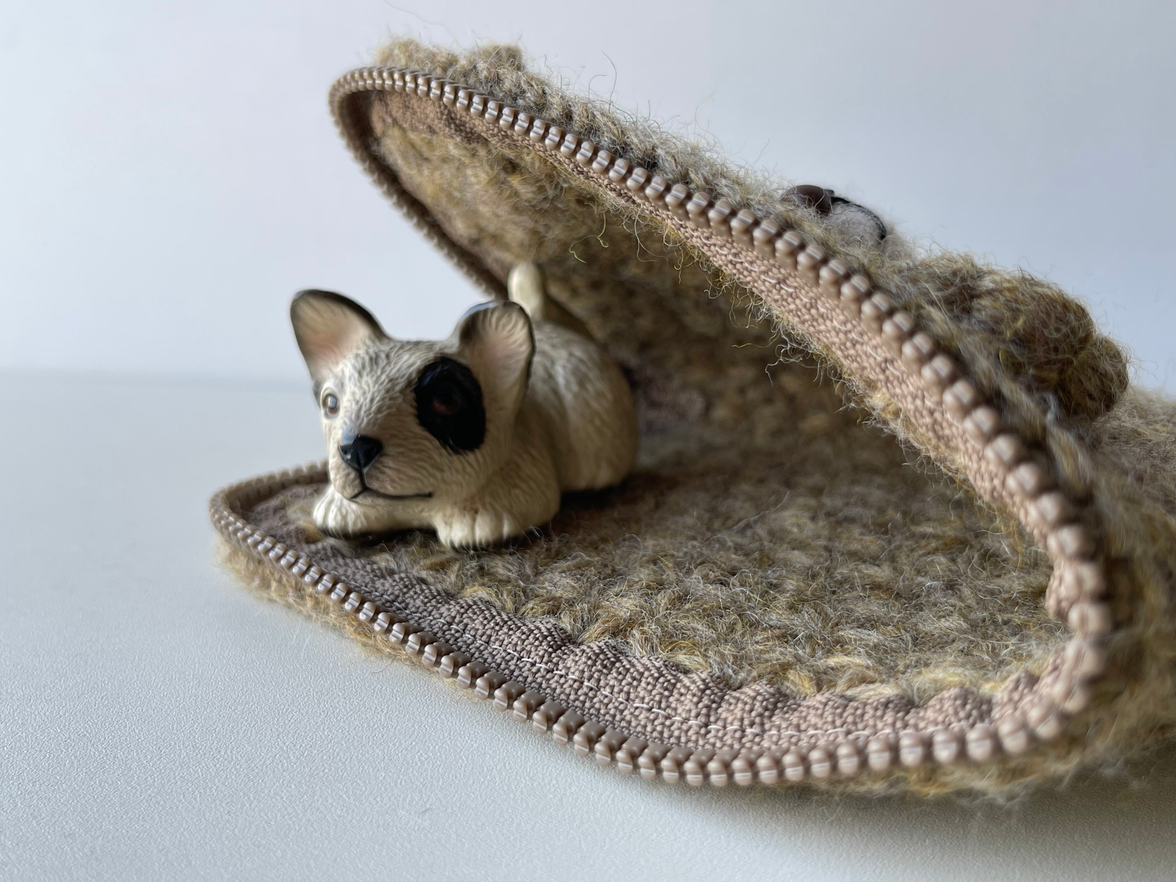 =リフ編みで編んだくまちゃんL字ファスナーポーチ=