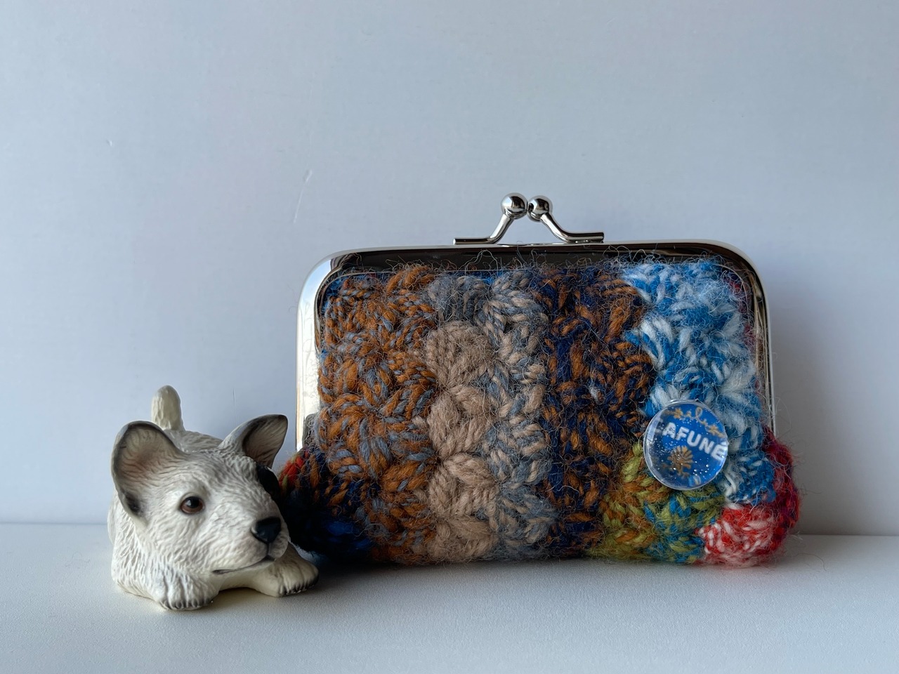 =リフ編みで編んだ四角い顔のくまちゃんがま口=