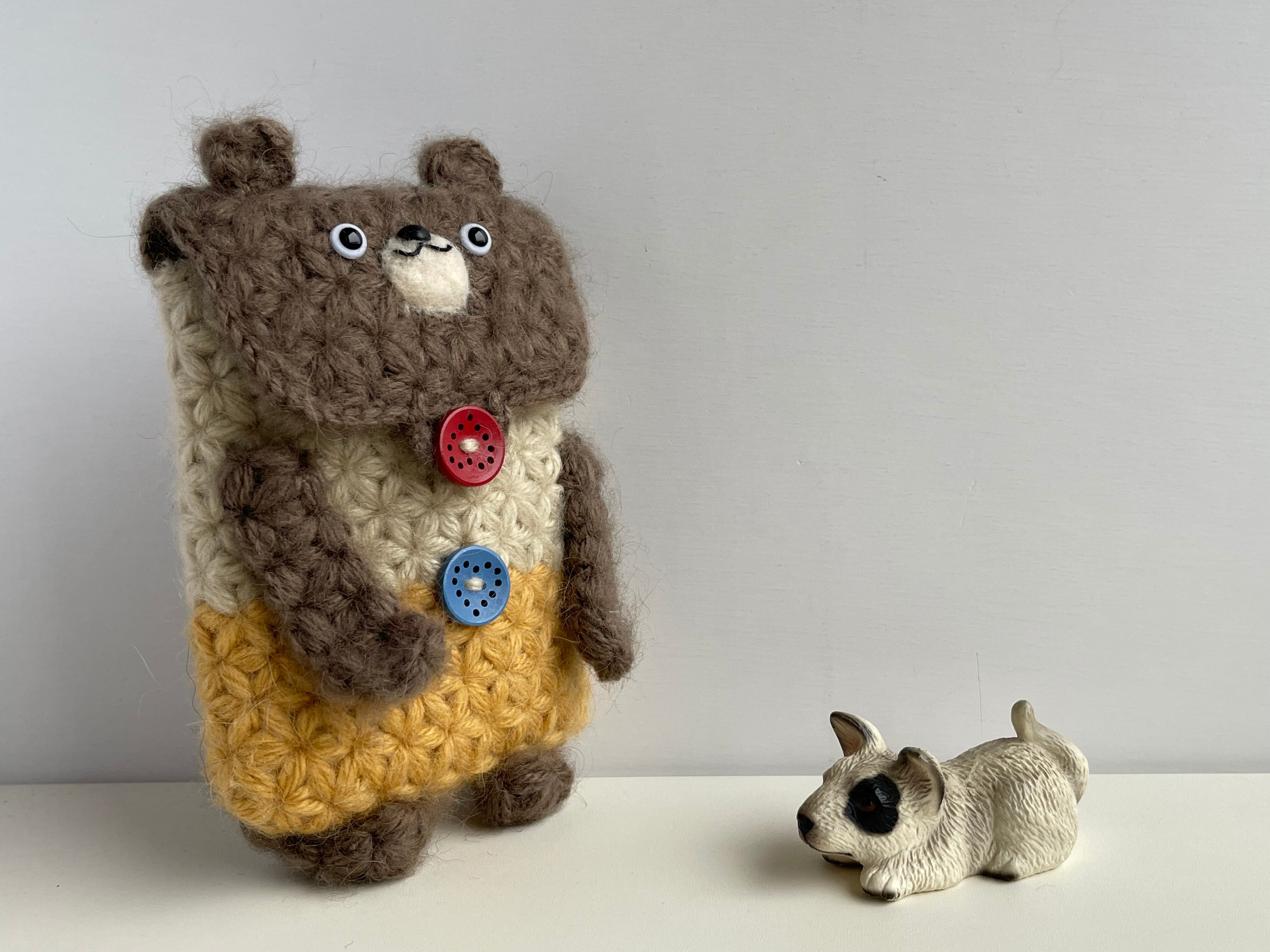 =リフ編みで編んだくまちゃんフタ付きボタン留めポーチ=